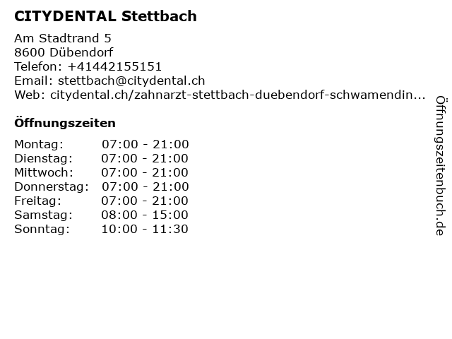 | Öffnungszeiten CITYDENTAL Stettbach in Dübendorf anzeigen | |