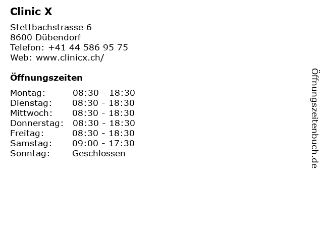 | Öffnungszeiten Clinic X in Dübendorf anzeigen | |