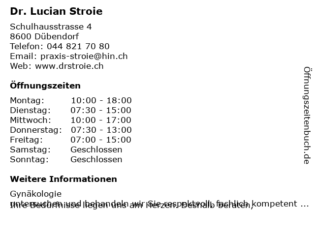 | Öffnungszeiten Dr. Lucian Stroie in Dübendorf anzeigen | |