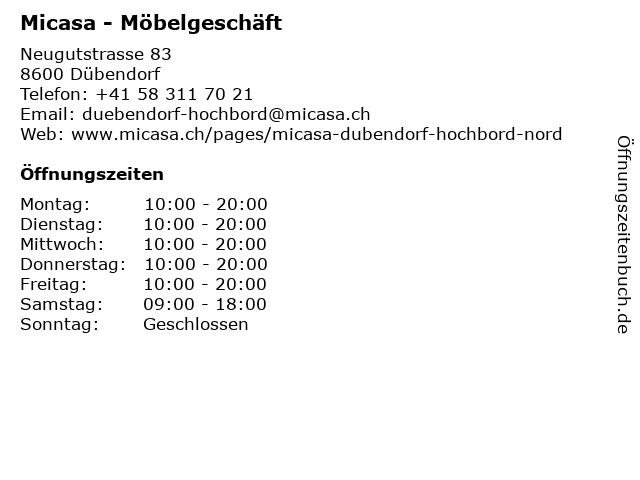 | Öffnungszeiten Micasa - Möbelgeschäft in Dübendorf anzeigen | |