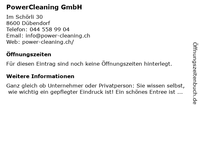 | Öffnungszeiten PowerCleaning GmbH in Dübendorf anzeigen | |