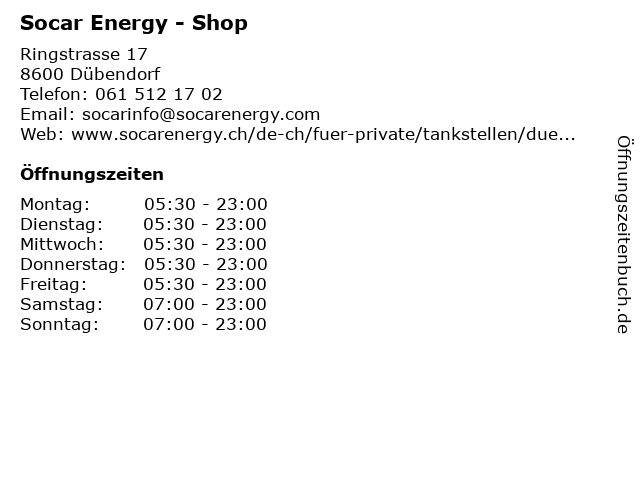 | Öffnungszeiten Socar Energy - Shop in Dübendorf anzeigen | |