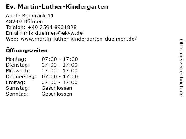 1 Martin Luther Grundschule - Sekretariat (Entfernung: 13,31 km) Hennewiger Weg 18, 45721 Haltern am See 4 Martin-Luther-Kirche - Ev. Johannes-Kirchengemeinde Münster (Entfernung: 21,13 km) Mecklenbecker Straße 439, 48163 Münster 6 |