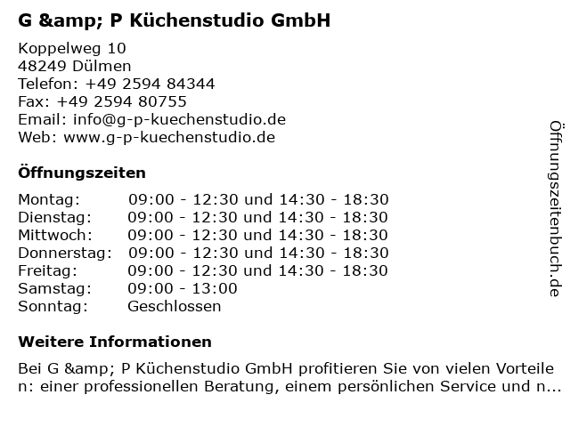 | Öffnungszeiten G & P Küchenstudio GmbH in Dülmen anzeigen | |