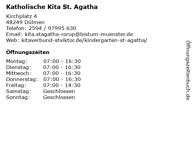 | Öffnungszeiten Katholische Kita St. Agatha in Dülmen anzeigen | |
