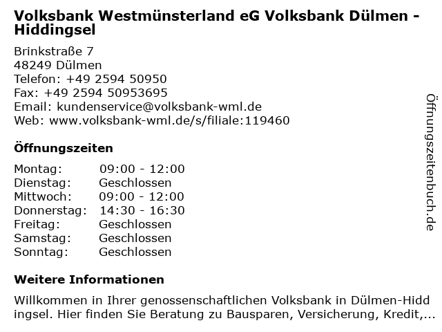 Branchen & Suchbegriffe zu Volksbank Westmünsterland eG Volksbank Dülmen - Hiddingsel:bank, beratung, eg, geldautomat, genossenschaft, hiddingsel, immobilienagentur, kredit, versicherung, volksbank, westmünsterland |