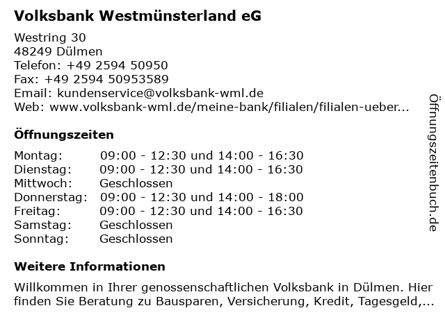 | Öffnungszeiten Volksbank Westmünsterland eG in Dülmen anzeigen | |