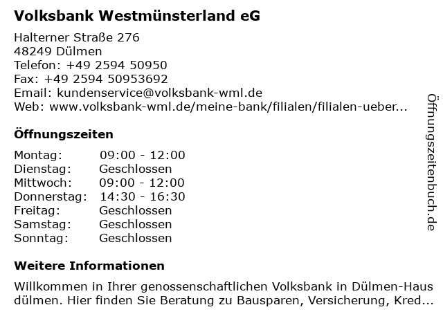 | Öffnungszeiten Volksbank Westmünsterland eG in Dülmen anzeigen | |