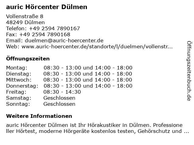 | Öffnungszeiten auric Hörcenter Dülmen in Dülmen anzeigen | |