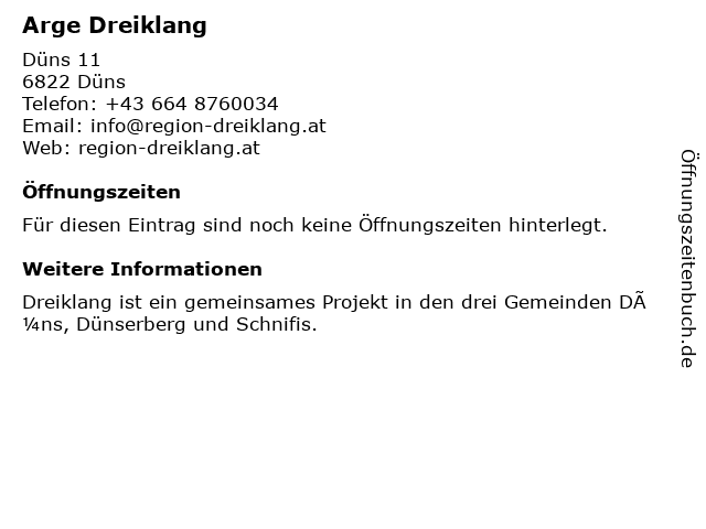 | Öffnungszeiten Arge Dreiklang in Düns anzeigen | |