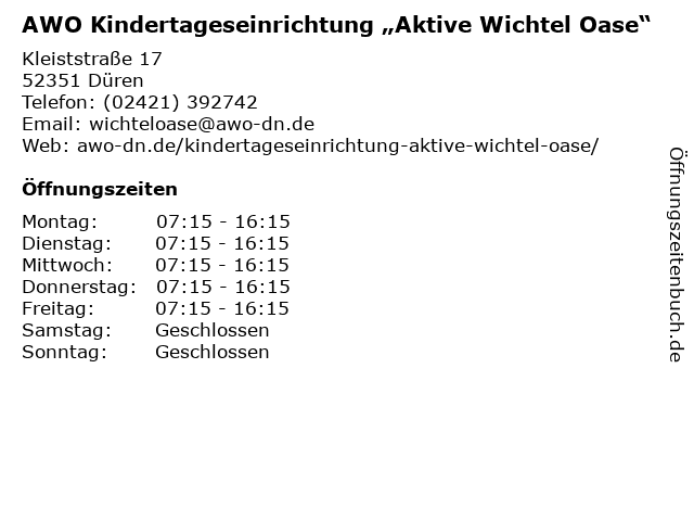 Branchen & Suchbegriffe zu AWO Kindertageseinrichtung „Aktive Wichtel Oase“:awo, familienzentrum, kinderbetreuung, kindergarten, kindertageseinrichtung, kita, oase“, wichtel, „aktive |