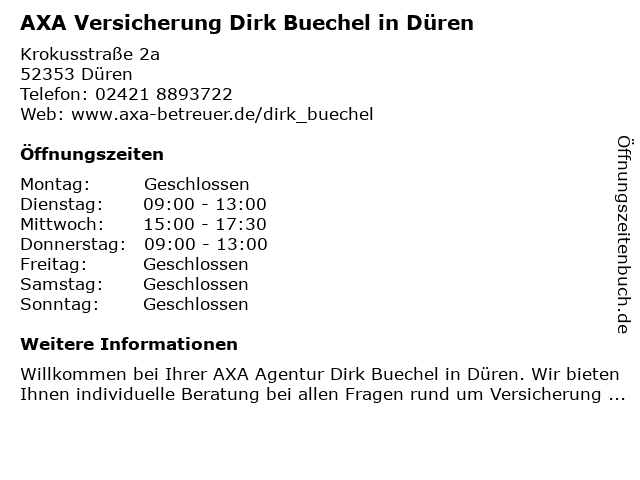1 AXA Versicherung - Generalvertretung Hans-Peter Hendrich (Entfernung: 0,00 km) Krokusstraße 2a, 52353 Düren 5 AXA Versicherung - Hauptvertretung Dirk Buechel (Entfernung: 11,63 km) Karl-Heinz-Beckurts-Straße 4, 52428 Jülich 6 AXA Versicherung - Hauptvertretung Tobijas Sprenger (Entfernung: 15,63 km) Kogelshäuserstr. 90, 52222 Stolberg |