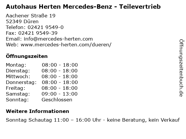 1 Autohaus Herten Mercedes-Benz - Verkauf & Showroom (Entfernung: 0,00 km) Aachener Straße 19, 52349 Düren 2 Autohaus Herten Mercedes-Benz - Werkstatt & Service (Entfernung: 0,00 km) Aachener Straße 19, 52349 Düren 4 Autohaus Herten GmbH Nutzfahrzeug-Center - Teilevertrieb (Entfernung: 6,12 km) Am Roßpfad 5, 52399 Merzenich-Girbelsrath 5 6 Mercedes-Benz Schain GmbH Kraftfahrzeuge (Entfernung: 12,41 km) An der wasserwiese 3, 52249 Eschweiler |