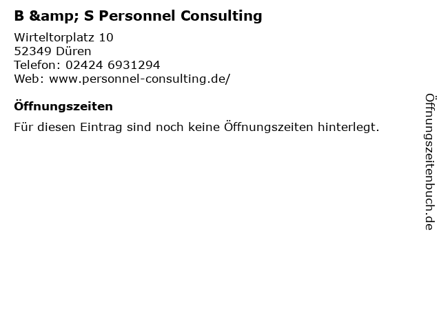 | Öffnungszeiten B & S Personnel Consulting in Düren anzeigen | |