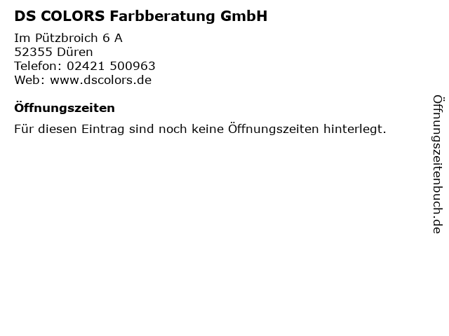 | Öffnungszeiten DS COLORS Farbberatung GmbH in Düren anzeigen | |