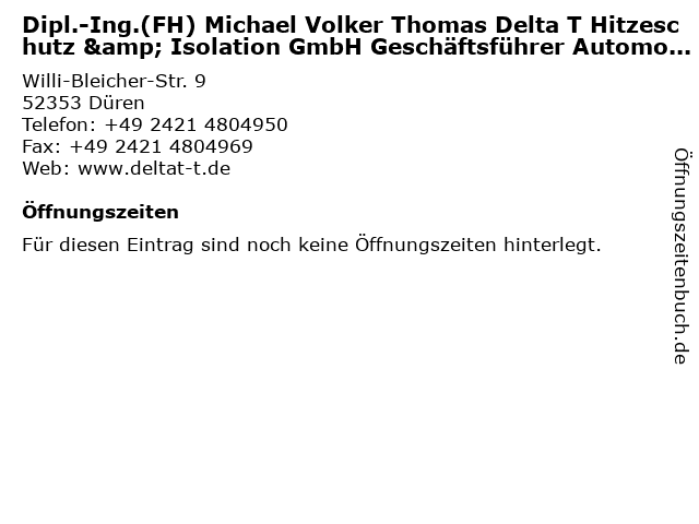 | Dipl.-Ing.(FH) Michael Volker Thomas Delta T Hitzeschutz & Isolation GmbH Geschäftsführer Automobilzulieferer anrufen | |
