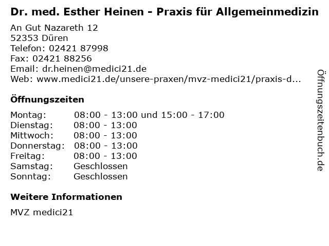 | Branchen & Suchbegriffe zu Dr. med. Esther Heinen - Praxis für Allgemeinmedizin:allgemeinmedizin, anja, dr., einzelpraxen, esther, facharzt, heinen, hogenschutz, innere, internisten, kassenpatienten, kieven, med., medizin, niedergelassene, praxis, privatpatienten, roland, ärzte |