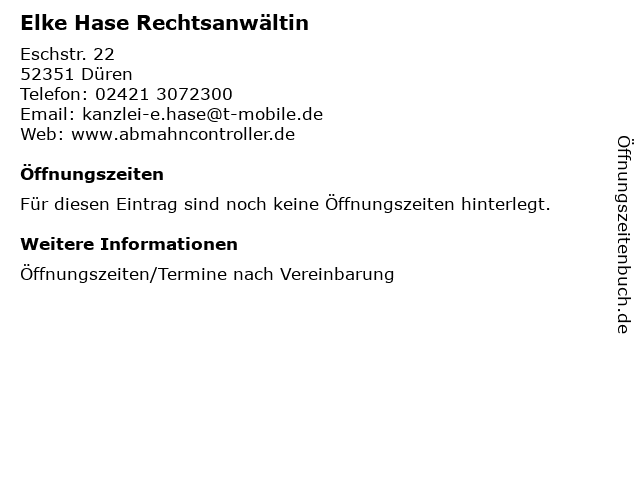 | Öffnungszeiten Elke Hase Rechtsanwältin in Düren anzeigen | |