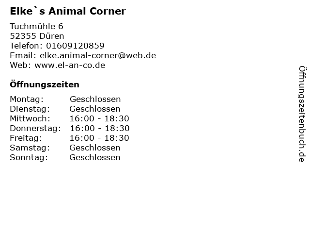 | Öffnungszeiten Elke`s Animal Corner in Düren anzeigen | |