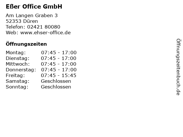 | Öffnungszeiten Eßer Office GmbH in Düren anzeigen | |