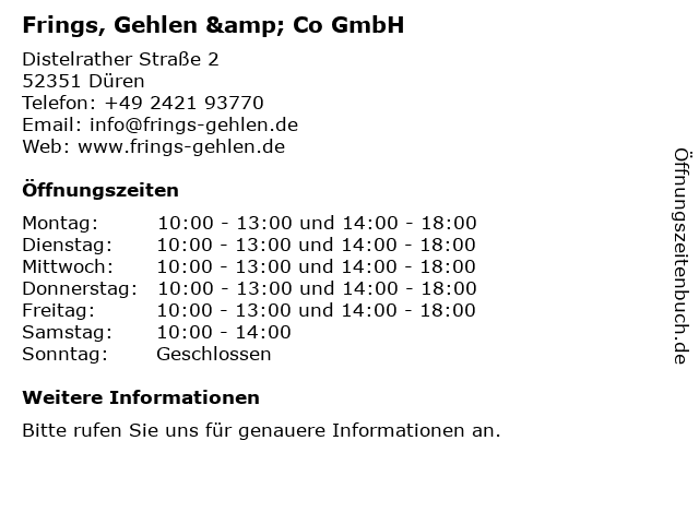 | Öffnungszeiten Frings & Gehlen in Düren anzeigen | |