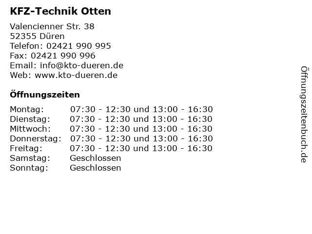 | Öffnungszeiten KFZ-Technik Otten in Düren anzeigen | |