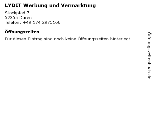 | Öffnungszeiten LYDIT Werbung und Vermarktung in Düren anzeigen | |