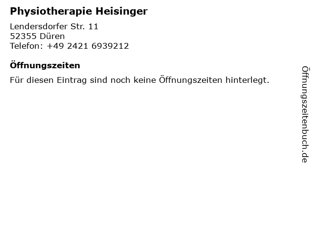 | Öffnungszeiten Physiotherapie Heisinger in Düren anzeigen | |