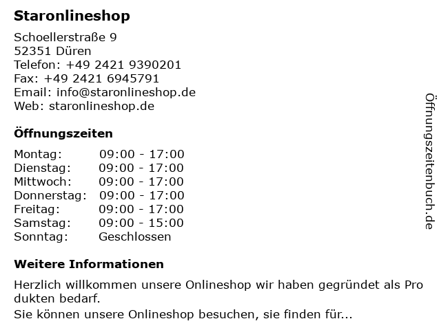 | Öffnungszeiten Staronlineshop in Düren anzeigen | |