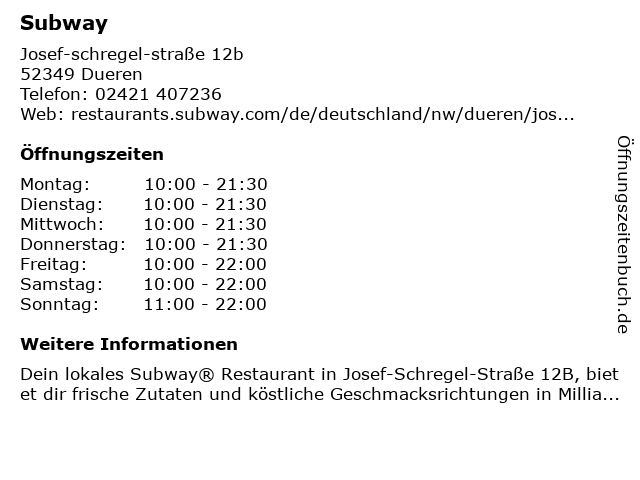 | Öffnungszeiten Subway in Dueren anzeigen | |