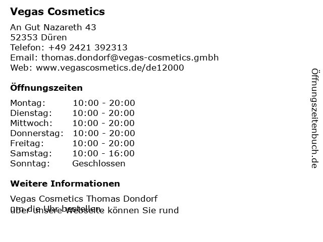 | Öffnungszeiten Vegas Cosmetics in Düren anzeigen | |