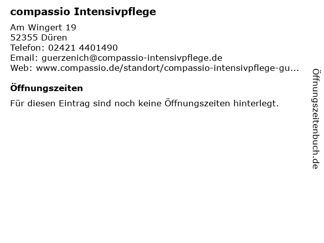 | Öffnungszeiten compassio Intensivpflege in Düren anzeigen | |
