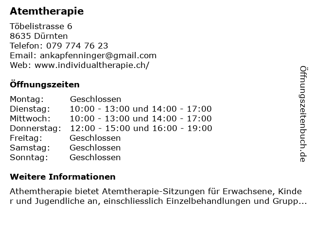 | Öffnungszeiten Atemtherapie in Dürnten anzeigen | |