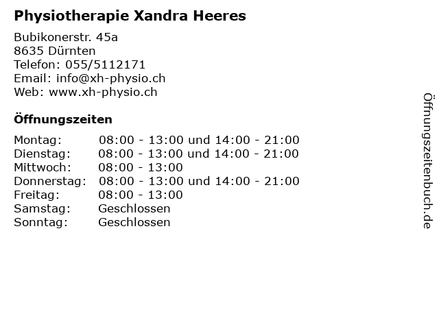 | Öffnungszeiten Physiotherapie Xandra Heeres in Dürnten anzeigen | |