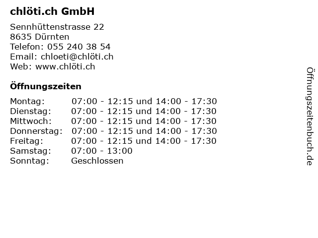 | Öffnungszeiten chlöti.ch GmbH in Dürnten anzeigen | |