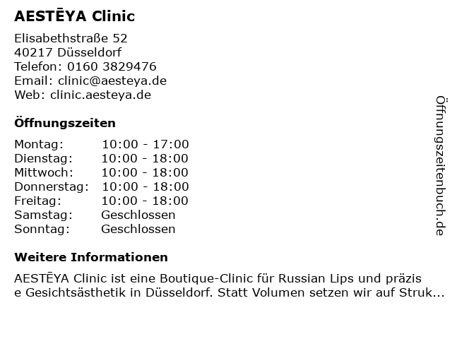 | Öffnungszeiten AESTĒYA Clinic in Düsseldorf anzeigen | |