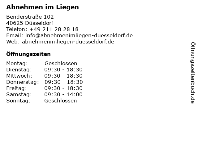 | Öffnungszeiten Abnehmen im Liegen in Düsseldorf anzeigen | |