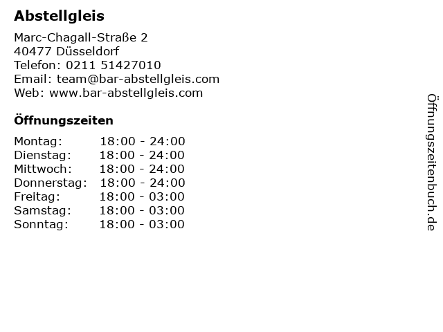 | Öffnungszeiten Abstellgleis in Düsseldorf anzeigen | |
