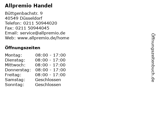| Öffnungszeiten Allpremio Handel in Düsseldorf anzeigen | |