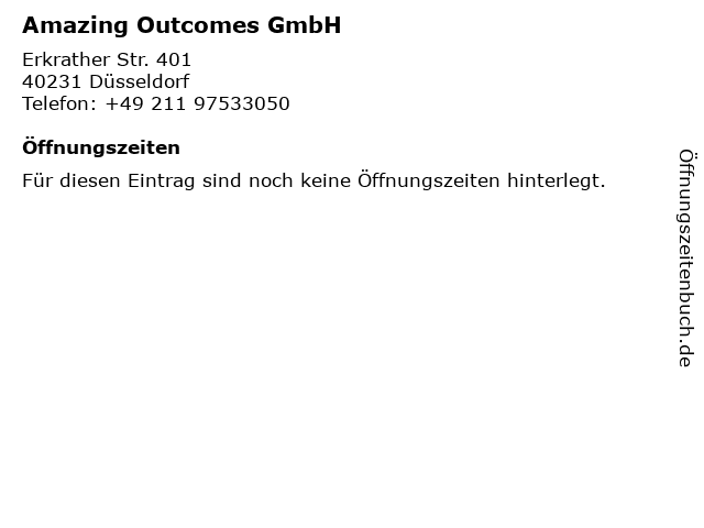 | Öffnungszeiten Amazing Outcomes GmbH in Düsseldorf anzeigen | |