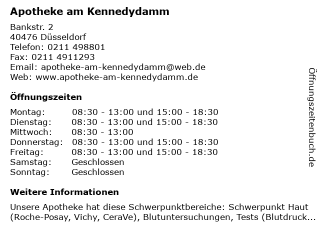 | Öffnungszeiten Apotheke am Kennedydamm in Düsseldorf anzeigen | |