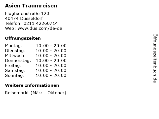 | Öffnungszeiten Asien Traumreisen in Düsseldorf anzeigen | |