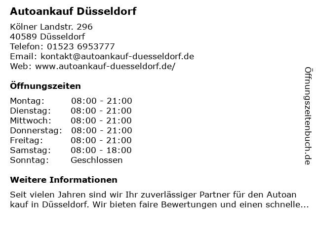 Öffnungszeiten Autoankauf Düsseldorf in Düsseldorf anzeigen | |