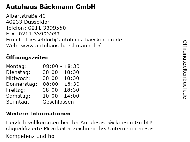 | Öffnungszeiten Autohaus Bäckmann GmbH in Düsseldorf anzeigen | |