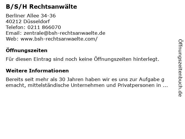 | Öffnungszeiten B/S/H Rechtsanwälte in Düsseldorf anzeigen | |