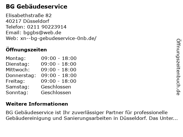 | Öffnungszeiten BG Gebäudeservice in Düsseldorf anzeigen | |