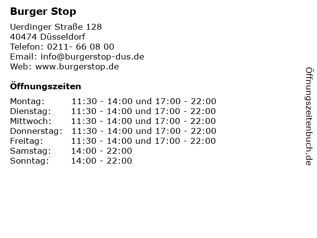 | Öffnungszeiten Burger Stop in Düsseldorf anzeigen | |