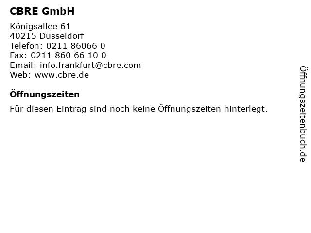 | Öffnungszeiten CBRE GmbH in Düsseldorf anzeigen | |