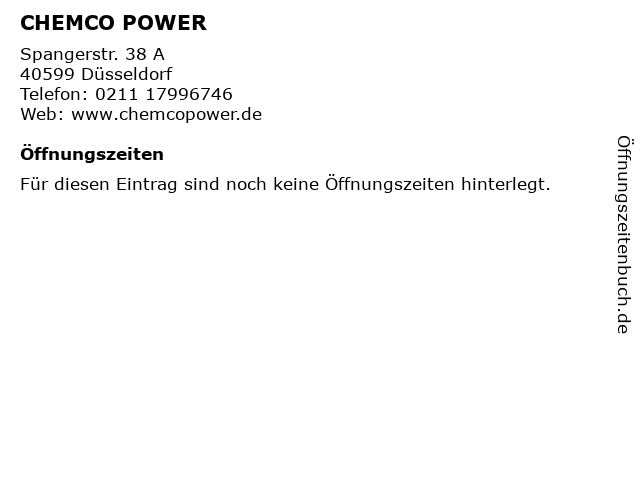 | Öffnungszeiten CHEMCO POWER in Düsseldorf anzeigen | |
