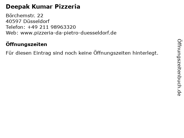 | Öffnungszeiten Deepak Kumar Pizzeria in Düsseldorf anzeigen | |